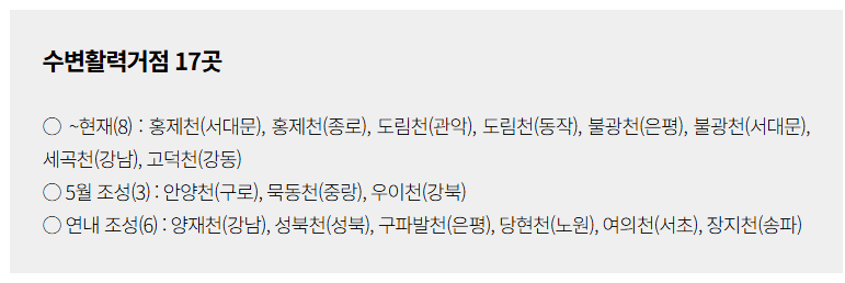 2025년 한 해 동안 총 9곳의 새로운 '수변활력거점'을 조성하여, 총 17곳의 도심 속 오아시스를 선보일 예정입니다.